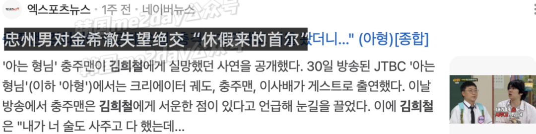 金希澈表示:因为我在《认识的哥哥》节目中是“打脸”姜虎东和徐章勋的角色,但其实我也很喜欢“被打脸”,当忠州男说来找我只喝到了烧酒、没有好的下酒菜,就再也没联系了,如果我说“没有啊,我们后来也见面了”就没意思了,所以我说的是“难怪没有回复了”,对此忠州男私下还跟我道歉,说不该说这个事情,但我觉得这不是需要道歉的事情,其实这就只是一个小插曲而已。