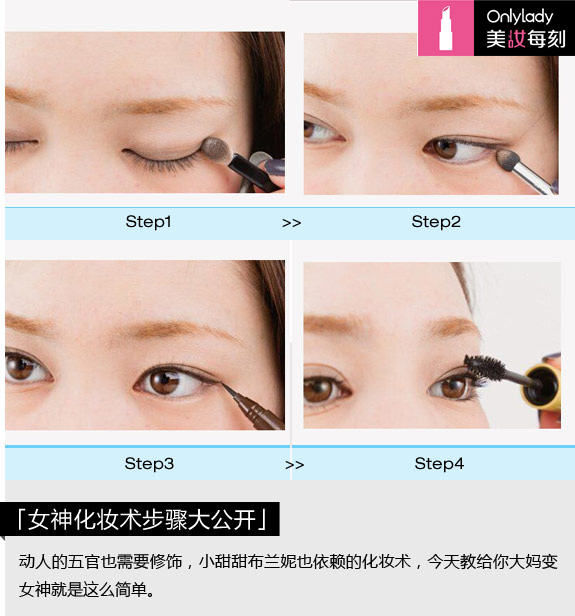 Step1:用珍珠白眼影在眼窝进行打底。然后再用金色眼影在上眼皮刷一条宽边,棕色眼影最后用来二重叠搭。