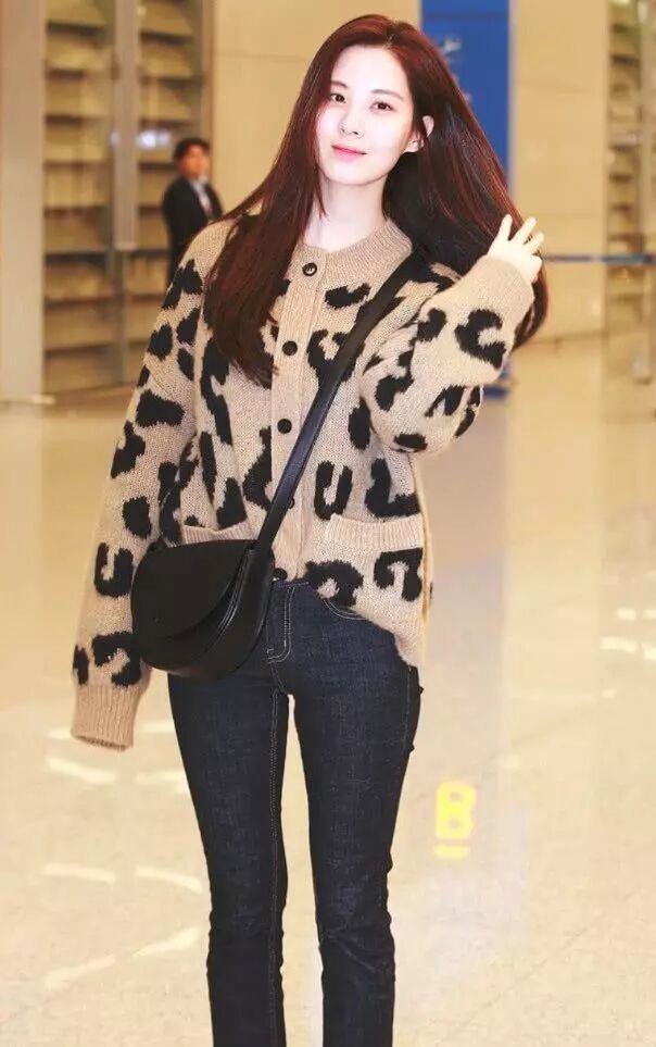 学徐珠贤开衫+牛仔裤,让你清新又时尚,她穿了件奶茶色的针织开衫,还是奶牛团队的款式,看起来清新甜美,色调上也显得比较温和,下搭一条黑色牛仔裤,简简单单的穿搭,却也不失时尚气息!