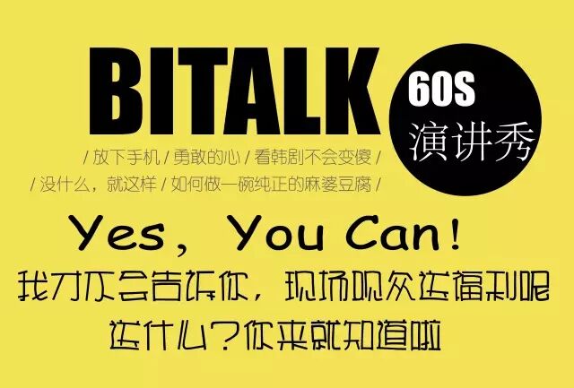 你知道吗?《我是歌手》第三季有一匹黑马是黄丽玲你知道吗?《奔跑吧,兄弟》第三季有一匹黑马是邓先森你知道吗?《中国好声音》第三季有一匹黑马是张碧晨那么《BITalk60s 演讲秀》第三季的黑马是......你吗?60s你能成为黑马我们都知道1min=60s,So what can you do?一分钟,一首歌还没到高潮;一分钟,一场戏还未拉开序幕;一分钟,却可以进行一场精彩的演讲BITalk的来源于电梯演讲,是根据美国麦肯锡公司的教训,因为无法从30层到1层的30秒钟内把咨询结果说清楚而失去一个重要客户,所以要求在极短的乘电梯时间内阐述自己的项目。进而推广到生活、求职和就业中,即在短时间内简洁清晰地表达自己的观点。BITalk什么来头?小编有话说小编想说的是,一分钟的演讲,其实是个不小的挑战。在进入学生组织面试和求职面试的时候,boss 的第一个要求就是一分钟自我介绍,然而匆忙之下,并没有将自己表达清楚,以至于与心仪的部门失之交臂。简直是大写的sui。。。活动说明为了方便更多想体验BITalk的同学参与,第一轮为题目自拟的即兴演讲。那就意味着,只要准备一份60s以内的演讲就可参赛,无关内容,无关形式,那60s的舞台只属于你,而我们将不会吝啬我们的掌声。等你呦小编有话嗦小编想说的是,内容不限意味着什么,尽请放开脑洞,各种或文艺,或现实,或逗比的话题,我们统统欢迎,请尽情闪瞎宝宝的眼,给一脸懵逼的观众们洗洗脑。嗦完了上一期高能回顾(部分)看韩剧会不会脑残?如何做一碗纯正的麻婆豆腐?全面开放二胎,我有话说八一八我理的女子一碗鸡汤:勇敢的心男人为撒这么累?口说无凭,上图!还有奖品一切都棒棒哒一等奖:奖金1000元人民币二等奖:奖金800元人民币三等奖:奖金500元人民币人气奖:奖金200元人民币现场抽奖:奖金不定额,红包不断小伙伴你还坐得住吗我的天呐,这么神奇吗?动动嘴就能挣钱?还不快到群里来比赛信息时间:4月中旬地点:北京理工大学良乡校区报名方式除了扫码加入我们,你还可以方式一:打开报名链接http://weixiao.qq.com/activity/apply/36975方式二:外场报名4月8日与4月11日,良乡北食堂外等你方式三:现场报名比赛现场也是黑马出现的战场!黑马少年,更多信息请持续关注“北京理工大学研究生会”公众号编辑:九尾长安排版:九尾长安