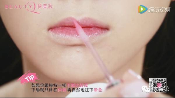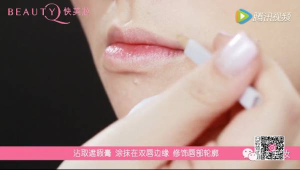 首先用遮瑕膏遮盖嘴唇轮廓,再沾取粉色唇彩涂抹整个嘴唇就OK了。