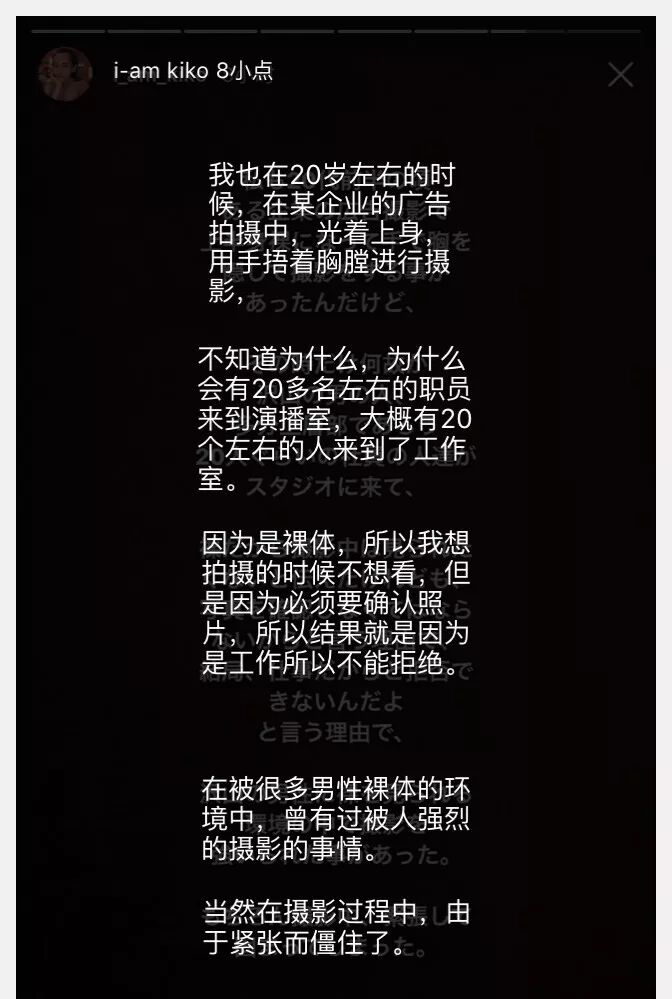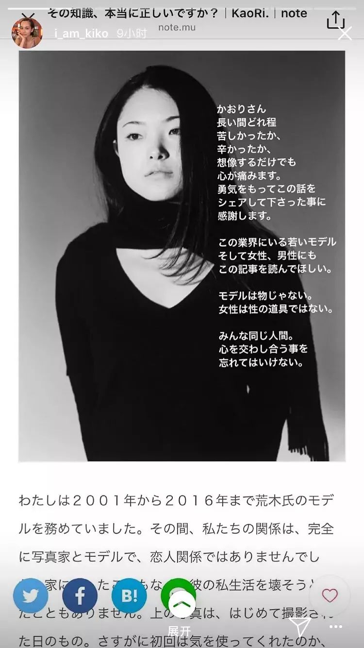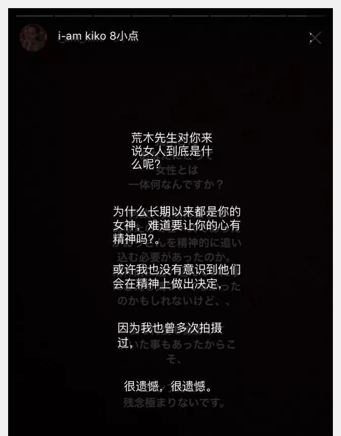 随后她发布了一段ins故事讲了自己在20岁时候参与荒木经惟拍摄时受到的不尊重:
