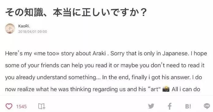 KaoRi这些年一直被媒体描述为“荒木的muse - 什么都可以尝试的神秘女人”,而这篇文章是KaoRi对于荒木经惟的反击,在文章中她写:“自己和荒木并不是媒体所写的情侣关系,荒木的艺术已经超越了怪异,是在践踏人的情感”