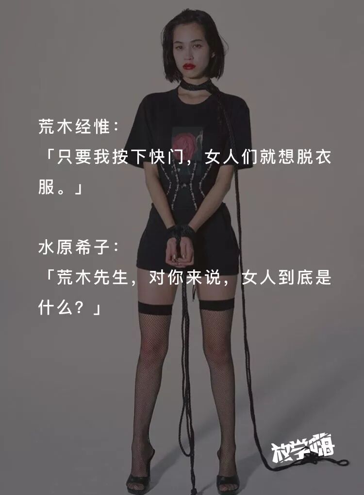 可能是拍过太多裸体后已经完全麻木,也可能是因为他骨子里抛不掉的男尊女卑思想。毕竟荒木经惟不止一次在公众场合说过: