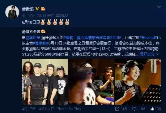 近日,前Beyond乐队鼓手叶世荣在微博转发消息称,由他担任发起人的“家驹…爱心延续慈善演唱会2016”,已经定为黄家驹6月10日的54岁生忌之日,在香港假湾仔会展举行,演唱会收益扣除成本后,将全数拨捐保良局和福幼基金会。