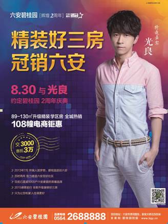 8月30日,六安碧桂园2周年庆典,荣耀2周年,光耀六安,情歌王子光良莅临现场,于六安市民共赴“童话”般的“约定”,活动现场,光良将与六安歌迷深情互动,共同庆祝生日,为歌迷们带来空前繁华的视听盛宴。