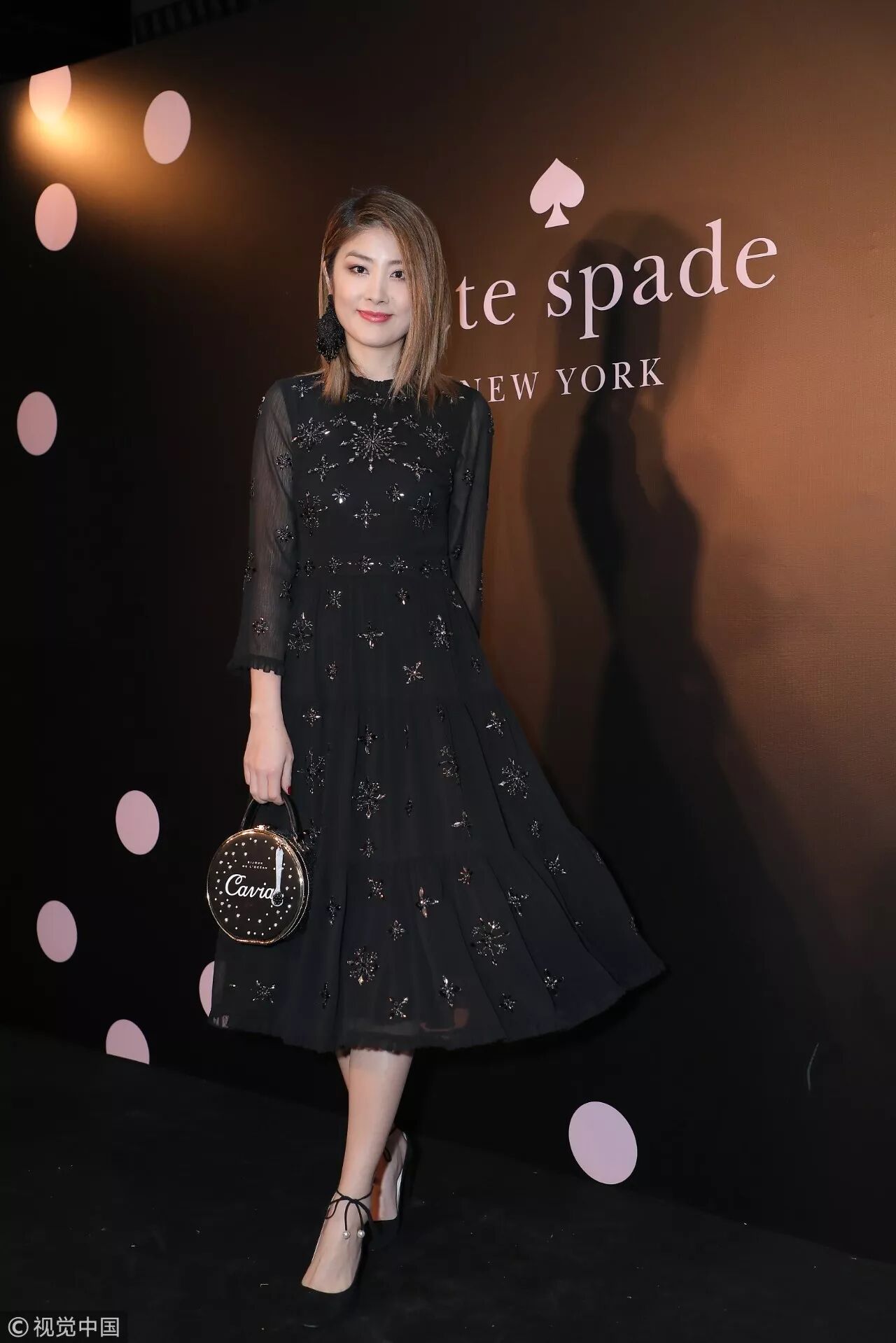 ▲陈慧琳这条小黑裙看似平常却颇具看点,雪纺的轻盈+黑纱的薄透+水晶刺绣图案,再搭配珍珠绑带麂皮圆头高跟鞋,整个造型华丽高贵。