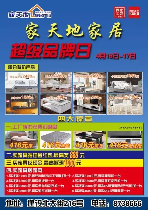 家天地家居广场4月16日至17日,超级品牌日,一线品牌盛大来袭。前所未有的优惠,客厅,餐厅,卧室一站购齐,省心,省时,省钱!!!给您意想不到的惊喜和震撼!快来选购吧!