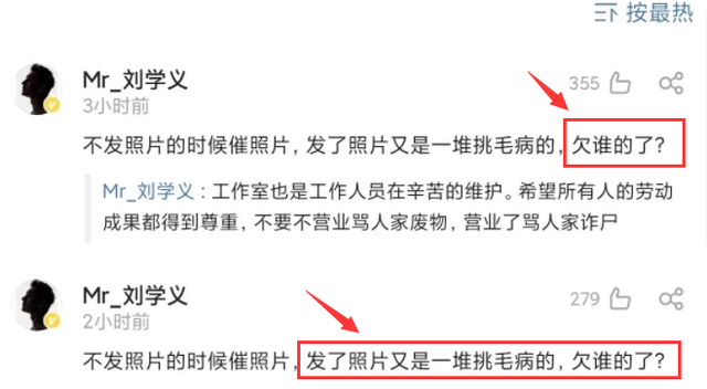 刘学义性格也不是特别好,有一回粉丝求他多发几张自拍,结果他立马傲慢无比,高高在上地怼了回去,那口气就像给粉丝施恩似的,不太讨喜!