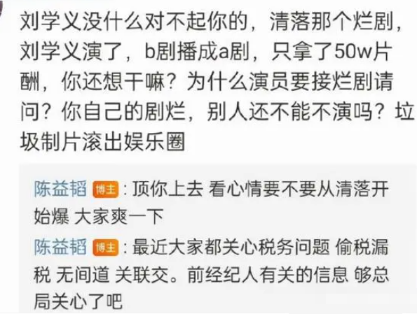 而且他身上是有一些致命性的黑料的,几年前曾经有制片人爆料,说刘学义涉嫌偷税漏税(欢瑞这个公司本身就很有问题,他们旗下多名艺人被爆过偷税漏税),但那个时候他是糊糊,没人关注这事,他现在出圈,势必会被翻旧账,接下来他能不能熬过飞升前的渡劫这很难说;