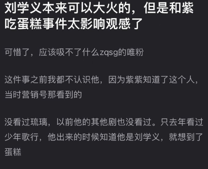 还有人管这件事叫做夜光蛋糕事件,不过当时刘学义跟杨紫都否认了恋爱的事情,也否认了吃同一块蛋糕。