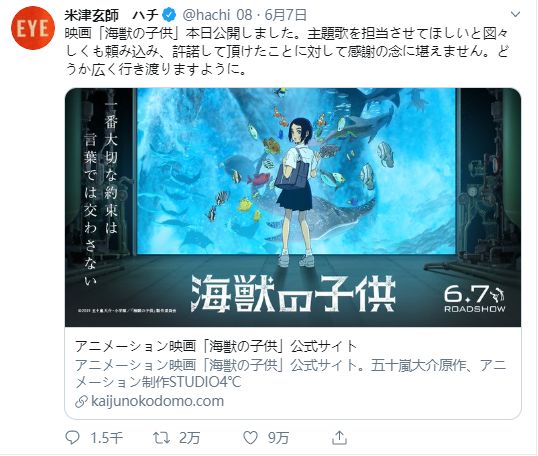今年六月上映的汤浅新作《海兽之子》,八爷表示,“在我多次厚脸皮的请求之下,同意了由我来创作主题曲”,嗯嗯嗯?说到这种程度看来不是营业而是真的很喜欢了,他真可爱.jpg