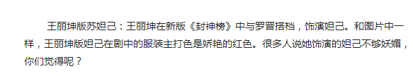 林心如版苏妲己:林心如在2008年的《封神榜之武王伐纣》中出演苏妲己,和其他版本的“妲己”大为不同的是,这个版本的妲己是比较纯良的,从图片中略显纯情的服饰就可以看出。而且,她对纣王的感情也是出于真心的。
