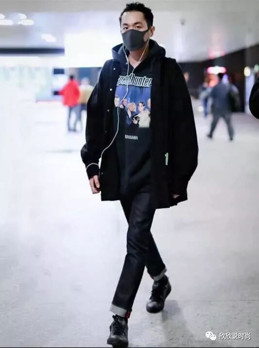 这就是近日张若昀现身机场时候的款式造型的搭配啦,你们看看张若昀这一身造型的搭配简直帅到没朋友呢,穿着一件黑色的字母图案卫衣搭配一条蓝色的牛仔裤外搭配一款黑色的大衣外套,既保暖同时又不失时尚感,脚踩着一涮黑色的休闲鞋,在造型上干练的发型,精致的五官带着口罩很低调呢,整体的款式的搭配尽显潮流帅气感!