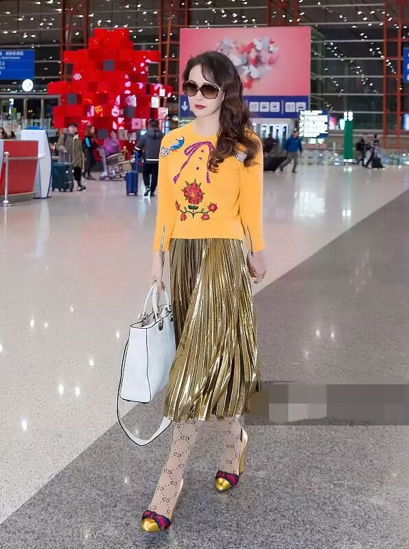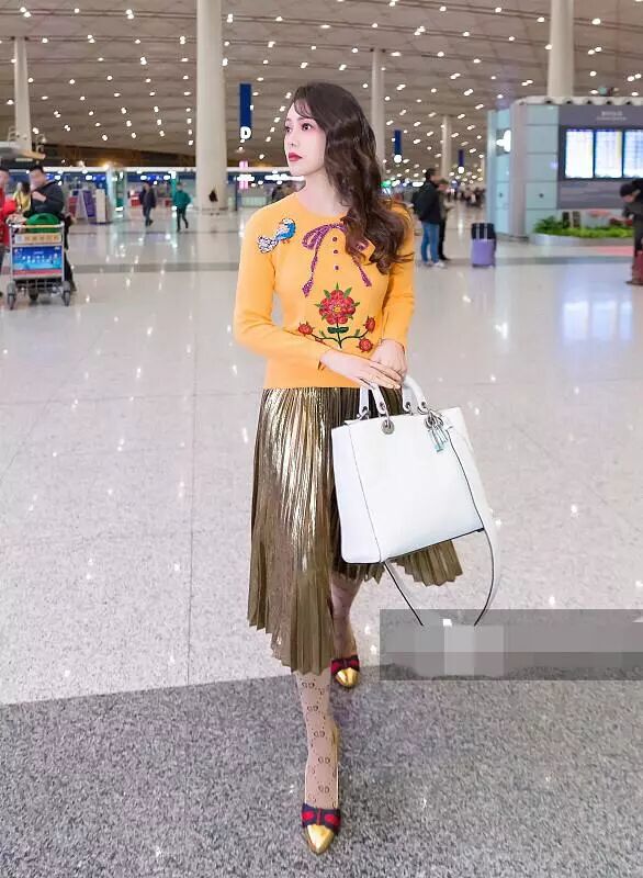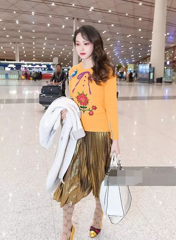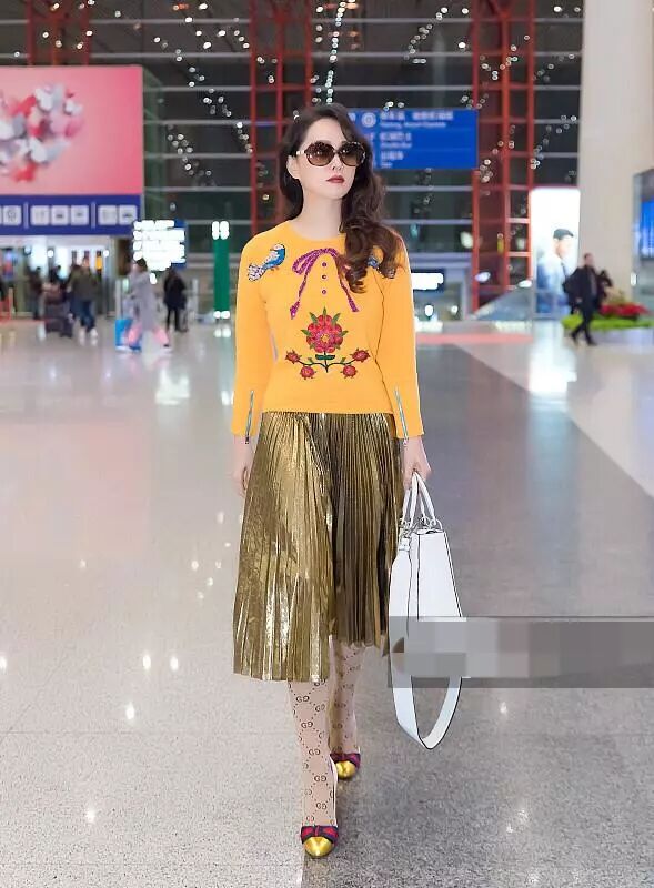 如今家庭幸福美满的伊能静,日常穿着也越发时尚,身穿亮黄色修身针织衫,搭配金色过膝百褶裙,白色包包与外衣呼应,时尚感极强,复古优雅的同时不失女王气质。