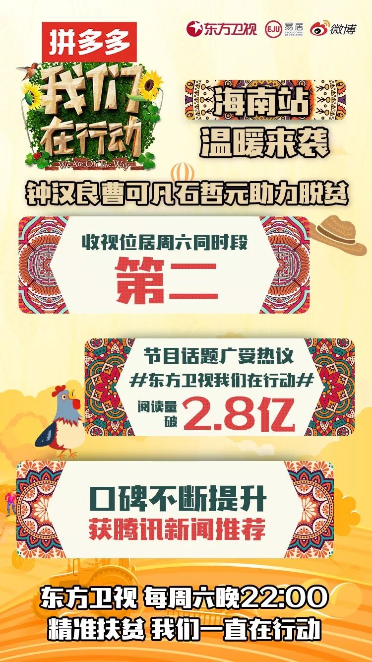 上周六晚22:00,由东方卫视、易居乐农、新浪微博联合出品,拼多多冠名的《我们在行动》第二季第五期如约播出。著名演员钟汉良与主持人曹可凡、企业家石哲元、主持人陈蓉一道来到海南省白沙黎族自治县牙叉镇的深度贫困村——对俄村。为帮助村民脱贫致富,几人对当地陨石坑内的特色经济作物进行了初步了解,钟汉良更是在茶园亲手尝试“铁砂掌”炒茶、“搅拌机”制作有机肥等打工助农项目,一天下来,还赚了一百元的工钱!