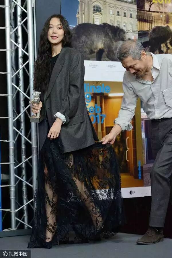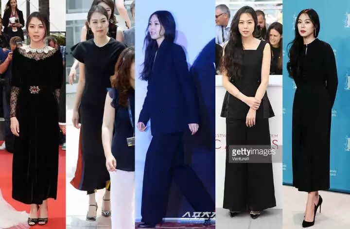 与之对比的,是金敏喜和她的导演洪尚秀去戛纳领奖时,洪尚秀把西装披在金敏喜身上,男士西装随意地松松垮垮地搭在身上,一头黑密的卷发和黑色的长蕾丝裙,就是现在流行的所谓“高级感“。