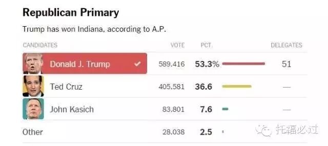 在5月4日印第安纳州的选举中,川普拿到53.3%的投票,将Ted Cruz 淘汰出总统大选。民主党那边则是桑德斯老爷子以52.5%的支持率胜出。