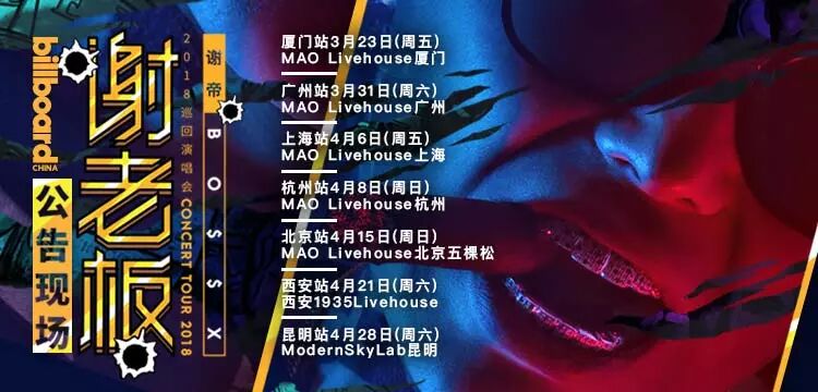 2015年,谢帝实现了的第一场个人演唱会愿望,在3年后的2018年,谢帝又站在了一条新的起跑线上。新专辑,新巡演,还有他对生活的新的思考,他将和Billboard中国、MAO Livehouse一起带着情景式的舞美设计,精致的灯光编排完成又一次对理想的冲刺。而这,也是谢帝的第一次巡演,RAP GOD谢老板的功力,咱们现场走着瞧。