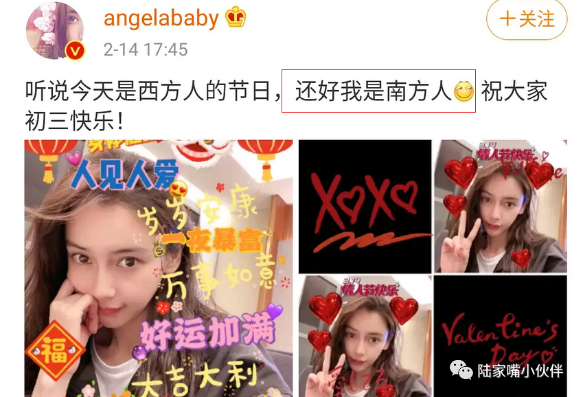 所以,如果一个已婚女子,发圈称自己"是南方人,不过西方人的节日",用这个梗来维持热度,即使是在娱乐圈也不是很好笑的。这说明,夫妻二人肯定是有问题了。