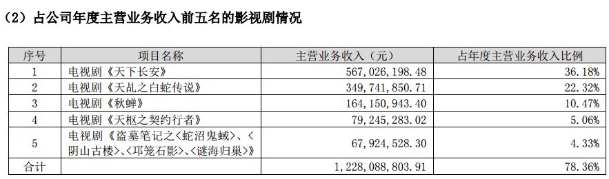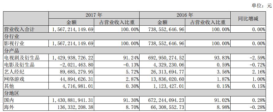 此外,2017年半年报中出现的收入排名前5的电视剧在上半年的收入,加上2017年年报中列举的收入排名前5的电视剧的收入总计为14.38亿元,超过了公司全年的电视剧收入14.3亿元。