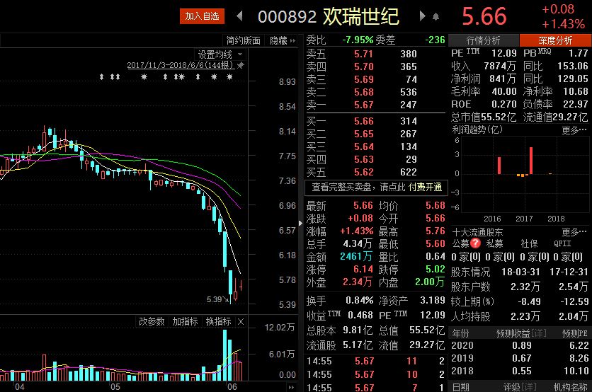 6月6日,欢瑞世纪的股价略有回升,上涨1.43%,以5.66元收盘。