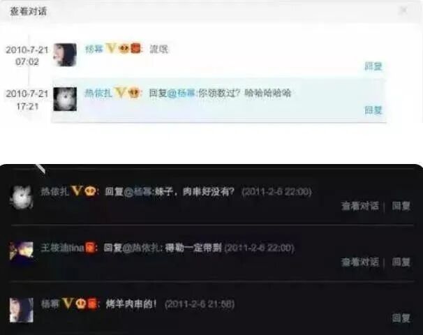甚至可以说,在《瑞丽》做平模时期,“编外”杨幂有点像“正式员工”热依扎的小粉丝,会嗲嗲地叫她“扎扎姐姐”。这种古董的互动被粉丝记录在了贴吧。