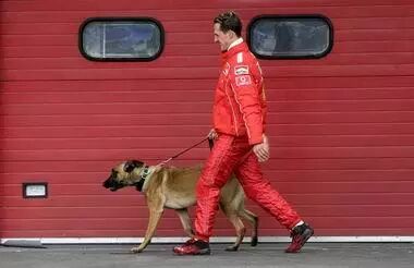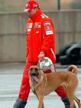 这狗叫Shiva-Schumacher ,是前车王的心头爱!车王是肿么体现这份爱的?分站赛夺冠后要感谢狗狗,没事的时候要带狗狗去世界看看,训练的时候要让车队派专人伺候狗狗。