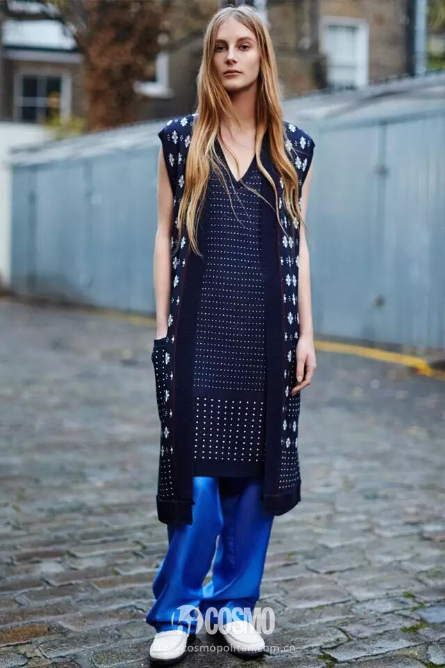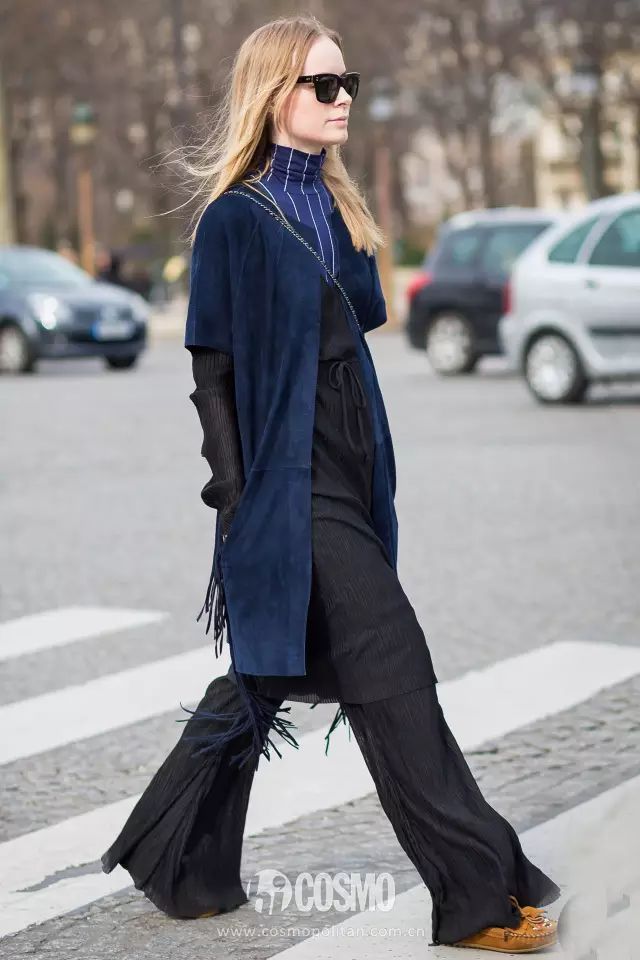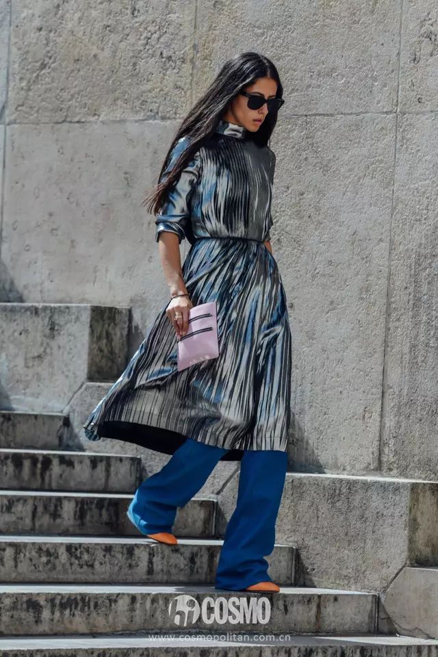里外三层的混搭时尚法则绝对是潮人最爱的单品之一,金属风的亮色长裙内搭蓝色裤装保暖同时增添几分不羁的味道。