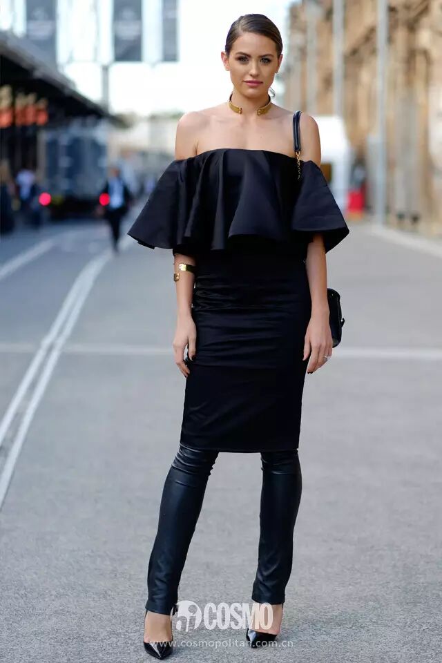 一字领荷叶边修身裙内搭皮革leggings,在服帖肌肤之间能不经意的展现出身材曲线,性感度直接爆表。