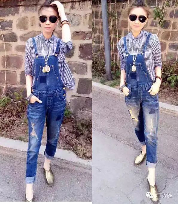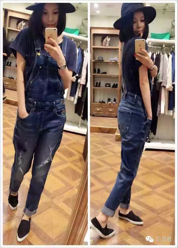 紧腿背带裤是年年都有啦,是经典的款式,今年更流行的是阔腿牛仔裤~