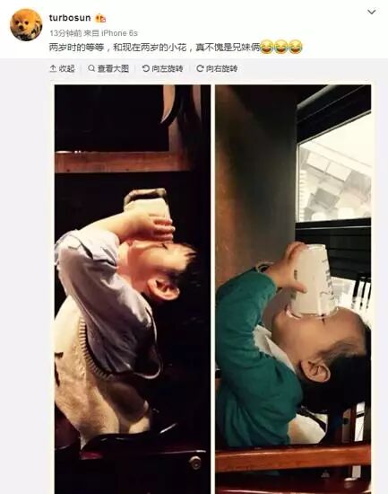 孙俪在微博中晒出一张两岁时的等等和现在两岁的小花妹妹喝水的对比照。照片中,两个小家伙举着杯子仰头豪饮,神同步的动作让网友感慨:真不愧是亲兄妹俩!