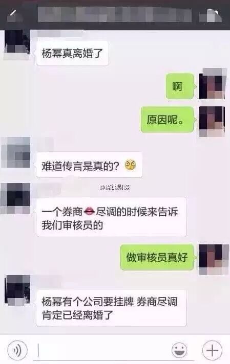 杨幂刘恺威离婚传了很久,双方声明也都发过几轮了,但还是有各种传言在坊间散播,这次,是金融界人士出手爆料。据悉,在一个金融界群里,有人声称:杨幂公司要挂牌上市,券商在做尽职调查时发现了她是离婚的状态。