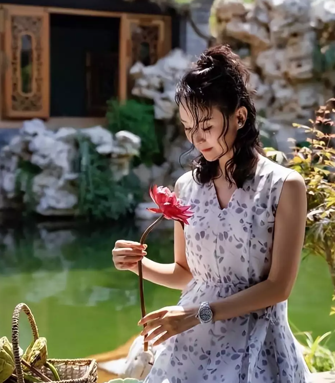 视频中,王艳身穿白色碎花裙,在池塘边提着一篮子莲子。46岁的她气质淡雅优美,看着人心旷神怡。