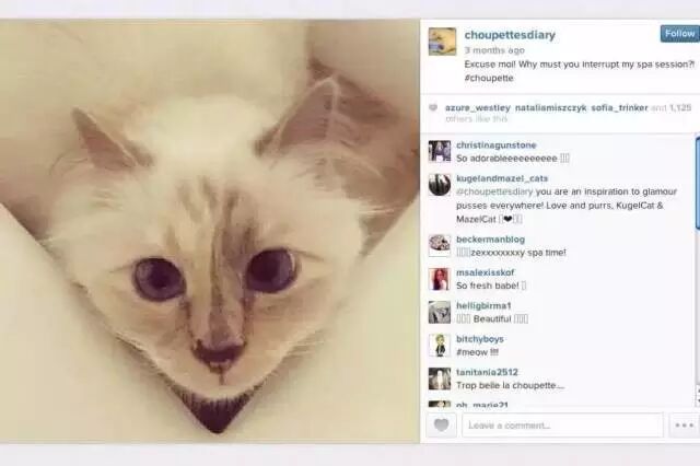 2014年,老佛爷还专门为她出书《Choupette: The Private Life of a High-Flying FASHION Cat》(Choupette,高端上天时尚猫的私生活),记录她生活的点点滴滴(奢华为主~)。