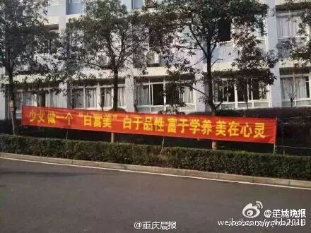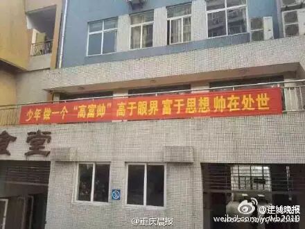 重庆8中宏帆校区新贴出两幅标语:少年做一个“高富帅”高于眼界 富于思想 帅在处世;少女做一个“白富美”白于品行 富于学养 美在心灵。这是该校老师对“高富帅”、“白富美”的新解读。学生和家长都觉得很新鲜。