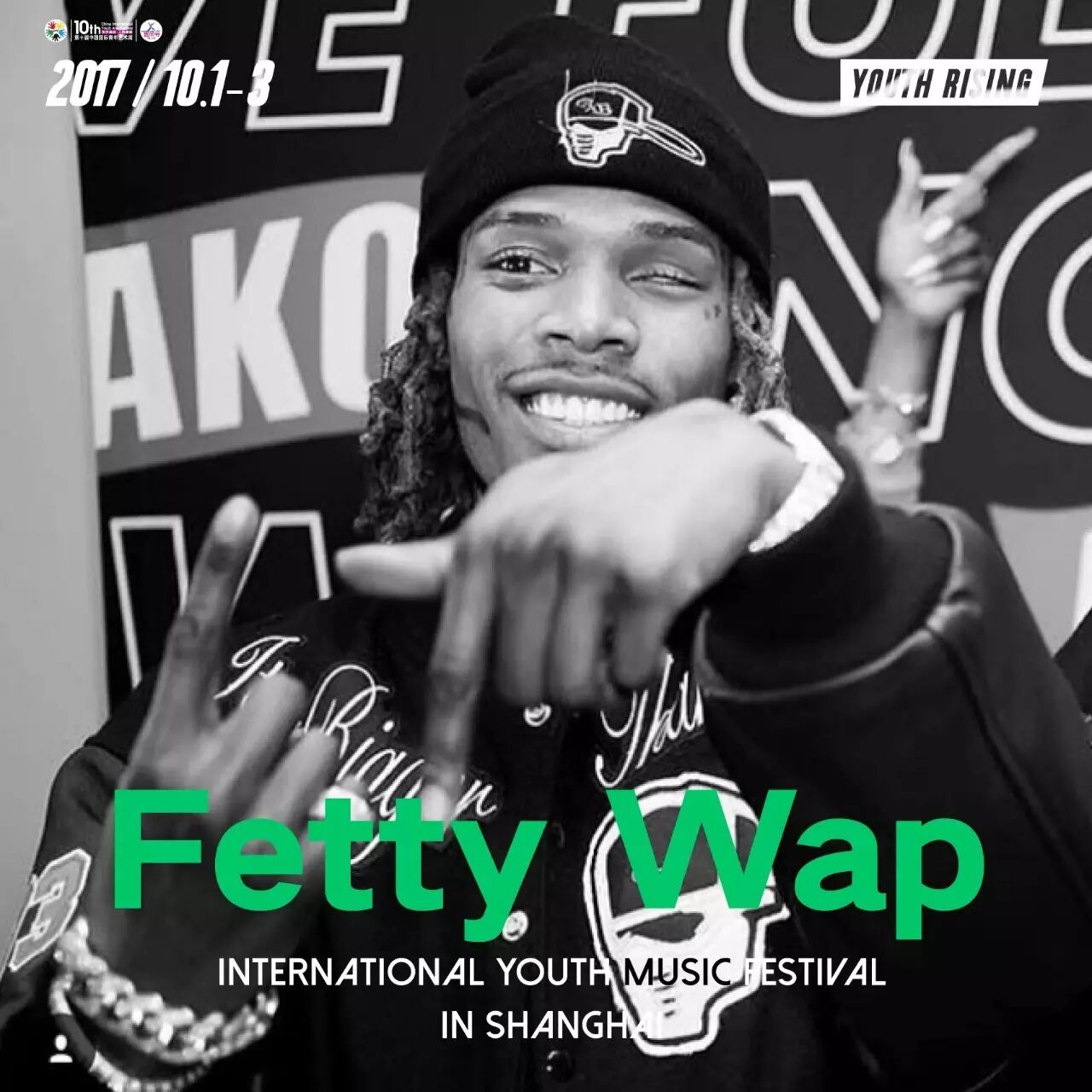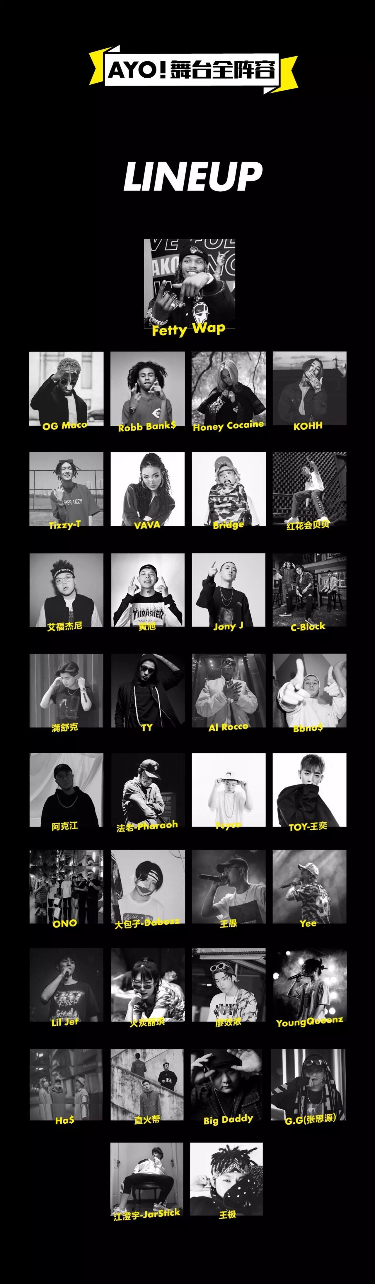 美国说唱歌手“眼哥”终于来了!2015年以超级热门单曲《Trap Queen》将新派旋律trap说唱带到商业巅峰的美国大牌说唱艺人Fetty Wap将中国首秀献给AYO!嘻哈舞台,2015年发行个人首支单曲《Trap Queen》并名声大噪这首被称“神一般存在的歌曲”在soundcloud上播放200,000,000次,MV在YOUTUBE上的点击量已达到5.47亿次。 在美国Billboard Hot 100单曲榜最高排名已达到第2名。Fetty Wap成为Eminem之后第二位在Billboard Hot 100排行榜同时有三首进入Top20的说唱男歌手,也是Lil Wayne之后第二位有三首热门歌曲连续进入排行榜Top10的说唱男歌手