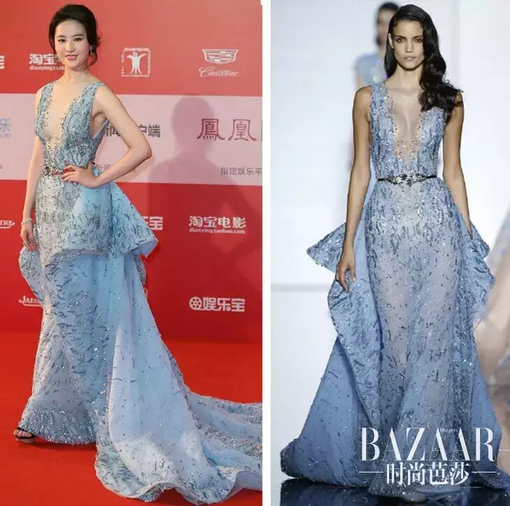镶满水钻的天蓝色深V礼服把她白皙的肌肤和曼妙的身材凸显的淋漓尽致!