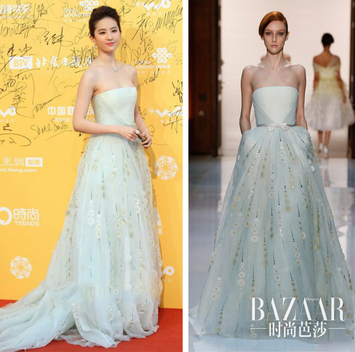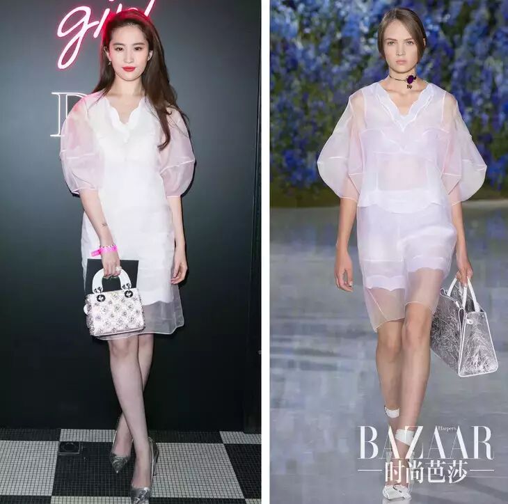着透视连衣裙的刘亦菲真是粉嫩甜美,搭配银色高跟鞋和Dior包包,Bling bling闪的不要不要的