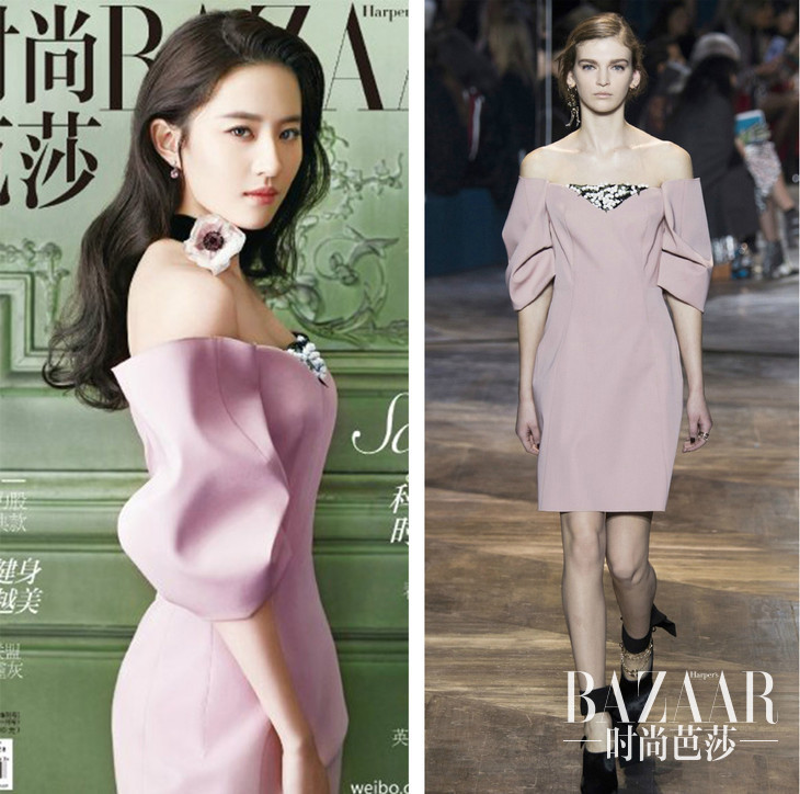 身穿粉色露肩抹胸连衣裙登上封面的神仙姐姐温柔甜美中带着满满的攻气,礼服来自Dior 2016春夏高订