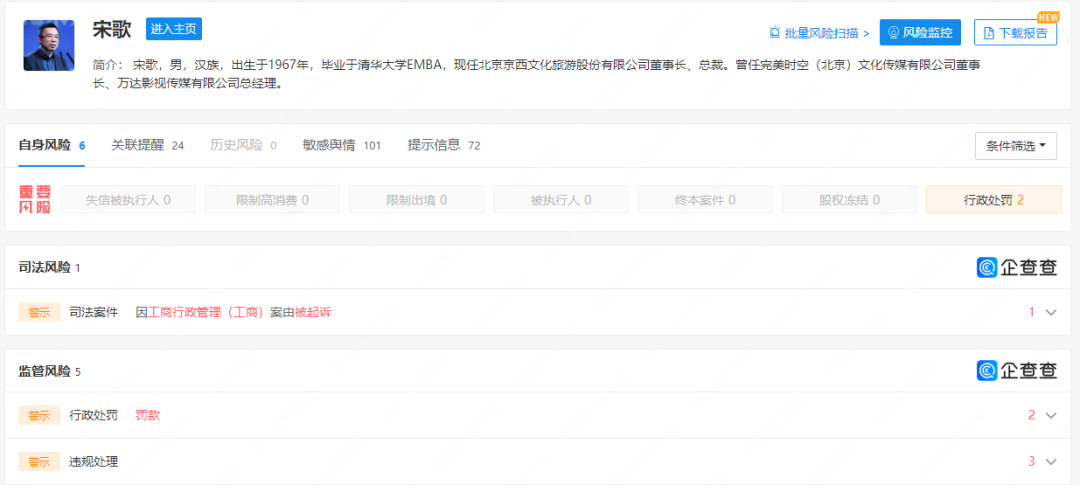 宋歌为北京文化(000802)前董事长,曾任北京完美时空文化传播有限公司董事长、万达影视传媒有限公司总经理,他还曾是《我不是潘金莲》《同桌的你》等多部电影出品人。