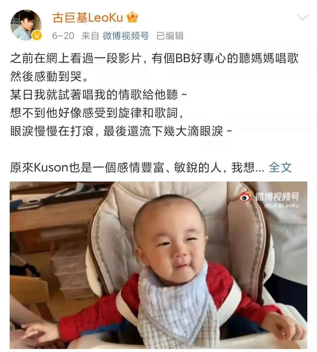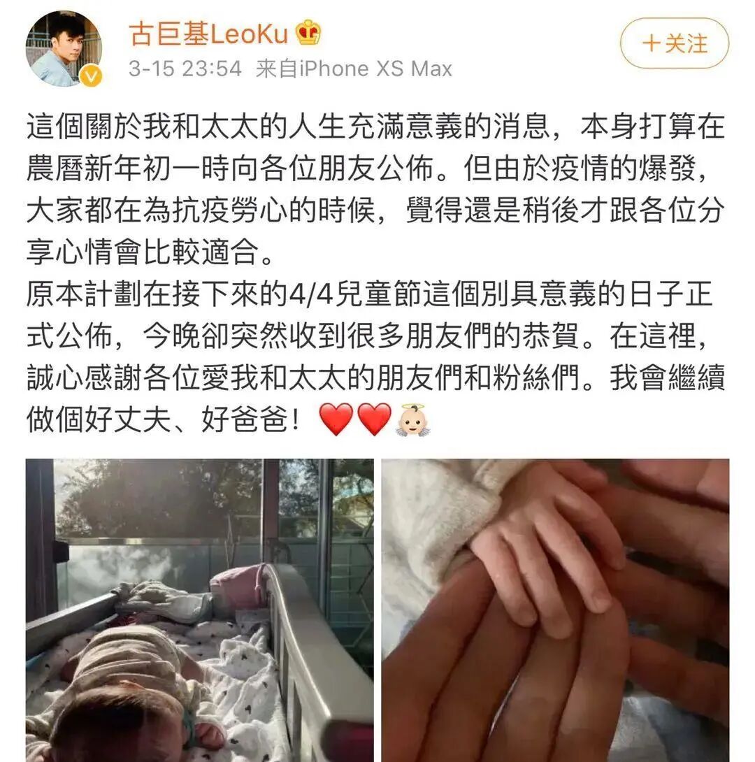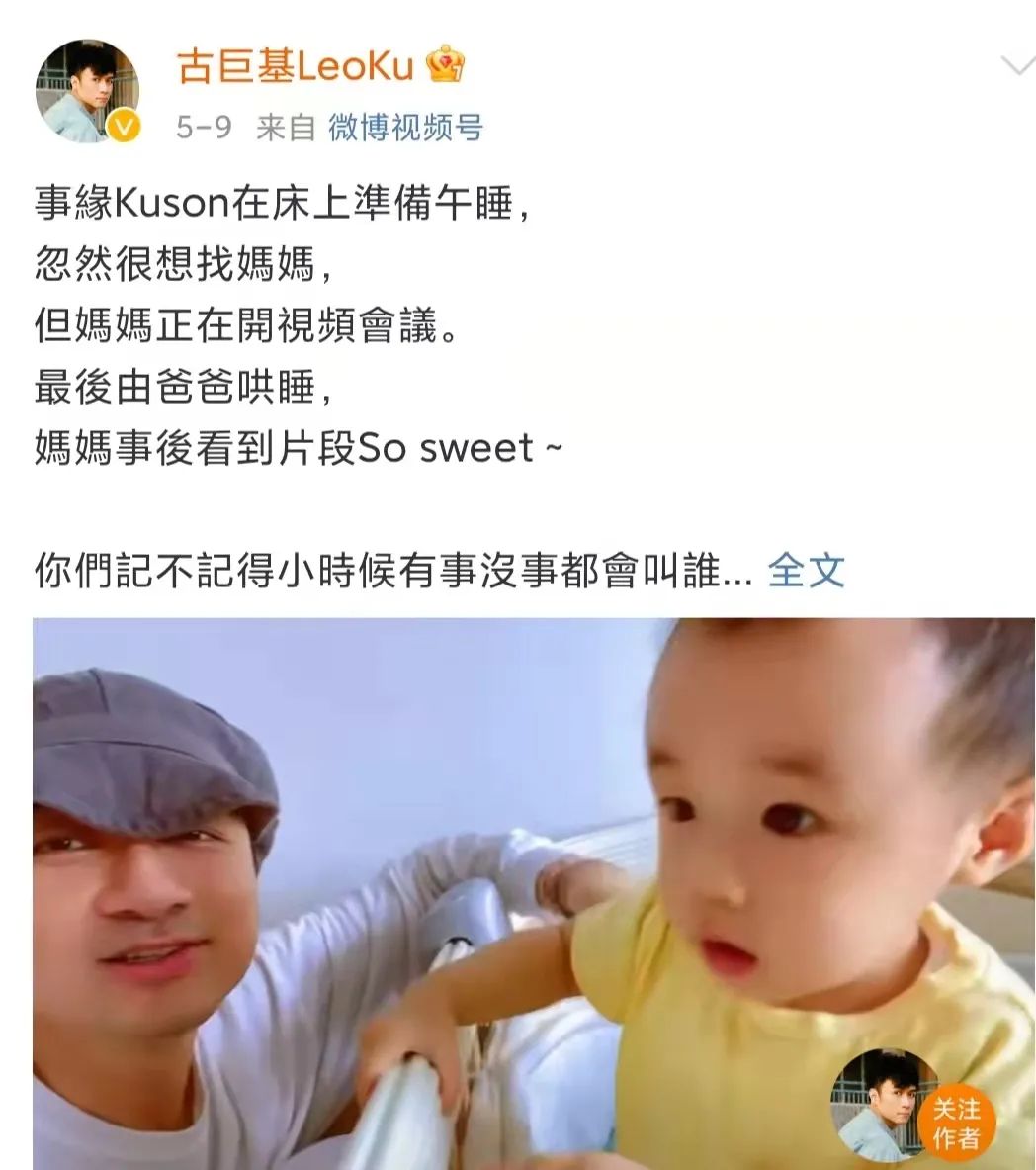 还记得古巨基吗?他又双叒叕晒儿子kuson了! 橘子娱乐 港台男星 2021-11-01 18:04:47 1171 创作不易,用心坚持,欢迎请BaGua喝几杯爱心咖啡!打赏并支持本文 打赏并删除本文 编辑:猪五花哈喽,小橘子们!古巨基又双叒叕晒娃了!10月31日万圣节,古巨基晒出了儿子kuson(古晋匡)装扮成南瓜的照片↓kuson和古巨基眉眼十分相似,迷你版古巨基。2020年,48岁的古巨基通过社交平台宣布了自己升级当爸的好消息。之后,古巨基便化身晒娃狂魔,宝宝唱歌↓午睡↓总之,成长的点点滴滴都乐于分享。面对儿子,也能变成亲亲狂魔,(这满满的父爱都快溢出屏幕了)但是古巨基中年得子的喜悦的背后是妻子陈韵晴的心酸付出,孩子出生那年,陈韵晴已经52了,毫无疑问的高龄产妇。此前就有媒体报道,两人为了要孩子多次尝试试管婴儿等辅助手段,其中滋味可想而知。陈韵晴原名陈英雪,1968年出生,和霍汶希一样是英皇第一批经纪人。1993年陈韵晴成为古巨基的贴身助手,在此后长达二十多年的时间里默默成为了古巨基背后的女人。陈韵晴比古巨基大四岁,在古巨基事业的起步阶段她起到了至关重要的作用。彼时的陈韵晴是英皇娱乐的金牌宣传,时至今日依然和港圈的多位明星都保持着较好的联系,古巨基只是刚签公司的新人。今年1月19日,陈韵晴53岁生日,周慧敏在社交平台分享了28年前和陈韵晴的旧照,为她庆生。年轻时的陈韵晴还颇有几分港风美人的韵味。去年,儿子kuson出生时周慧敏也有送上祝福。陈韵晴对于古巨基来说是伯乐。古巨基在节目中也说过,陈韵琪他的音乐宣传,到后来变成经纪人。之前她是周慧敏的音乐宣传。甚至还介绍了古巨基和周慧敏认识。1993年,在陈韵琪担任音乐宣传期间,周慧敏狂揽多项大奖。就是这样的金牌宣传跑去给刚出道不久的古巨基做唱片宣传。1995年,古巨基因合约问题遭到雪藏,陈韵琪辞去工作帮助他度过难关,自费帮他购置贵重衣物,用自己之前的人脉帮他拉资源。古巨基的各种活动也是由她负责联系媒体等事宜。庆幸的是,古巨基不是《情深深雨蒙蒙》里犹犹豫豫的渣男何书桓,对于陈韵晴的付出一直铭记于心,2008年香港年度十大劲歌金曲颁奖典礼上,古巨基获得了最受欢迎男歌星,古巨基在台上真诚感谢了陪伴他多年的陈韵琪。2014年,古巨基求婚成功,两人正式注册结婚。2015年11月11日,两人补办了婚礼。古巨基还亲自画了两人的画像。两人关系正式公开后古巨基一反往日的低调, 多次聊起两人的日常。参加《金星秀》时说两人是自然而然在一起的↓家里资产也是陈韵琪在打理↓略带抱怨说太太当初不愿意公开恋情↓但幸福的眼神是藏不住的,“结婚后是什么感觉?”今年有媒体拍到古巨基一家三口一同出去游玩,看起来十分温馨。现在的古巨基微博不是在晒娃,就是在晒娃他娘。今年为妻子庆生时,称呼妻子为来世的女儿↓还附上了儿子和妻子小时候的照片对比,盖章认证母子二人一模一样。一家三口就是要整整齐齐↓最后一句娱乐圈的小朋友大家还想了解谁?往 期 回 顾 2021年 HAVE A GOOD TIME More... JUZI 创作不易,用心坚持,欢迎请BaGua喝几杯爱心咖啡!打赏并支持本文 打赏并删除本文 感谢您的支持鼓励,我会继续努力的!文章地址:用户邮箱:打赏金额:USDT 请输入数字点击”去打赏“,即可进行打赏支持本文章哦 古巨基 About the Author 橘子娱乐 功能介绍:橘子娱乐™ 给你快乐!橘子娱乐只提供新鲜、时髦、有趣的娱乐内容。我们拒绝平淡无奇的流水账,更鄙视毫不走心的娱乐态度。好内容值得被分享。 官方认证:北京橘子文化传媒有限公司 Related Posts 好久不见边伯贤啦,今天迎来退伍后第一次正式回归! 2023-07-10 20:57:24 还记得日本明星福山雅治吗?他怎么变成这样了? 2023-07-05 21:05:38 好久不见张根硕啦!也太肿了吧? 2023-05-19 17:35:59 还记得香港歌手孙耀威吗?他在悄悄秀恩爱? 2023-04-30 16:32:32 还记得古巨基吗?3岁儿子长这样? 2023-01-12 16:55:34 发表评论
