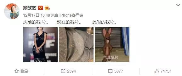 点开图片才发现这是一组怀孕前后的对比照,配图生动形象又真实,简直要被她笑死。关于“从前的我”,张歆艺配得是一张出席活动时身穿黑色礼服的照片,搭配上精美的发型和妆容,魅力十足。
