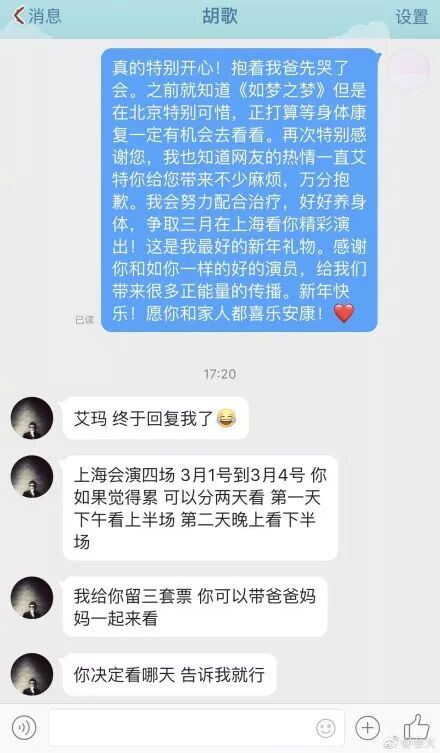 以为自己太过异想天开,没想到胡歌很快就私信她。