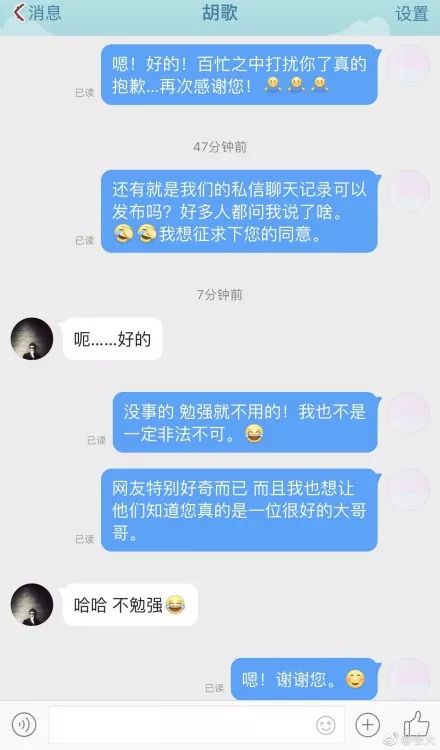 姑娘在征求胡歌同意后,将聊天记录发出来。