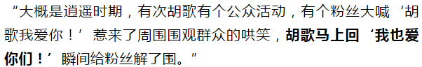 粉丝大喊“胡歌我爱你”引起哄笑,胡歌贴心地回了句“我也爱你们”。