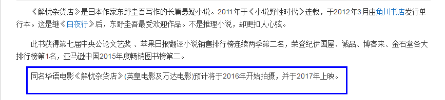 一本小说要拍成电影了,“同名华语电影《解忧杂货店》(英皇电影及万达电影)预计将于2016年开始拍摄,并于2017年上映。”