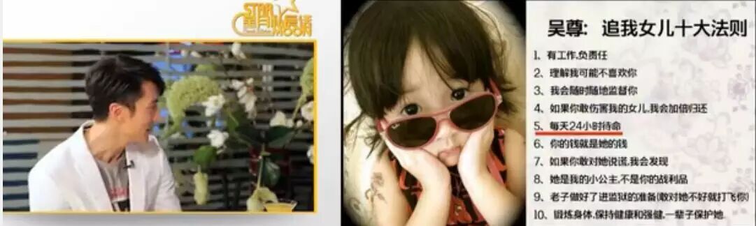 他爱女儿真的是爱到了极点,他不敢想象女儿结婚那一天,所以在节目中吴尊有了追neinei的十大法则,虽然有些夸张,但这就是一个父亲爱女儿的心。