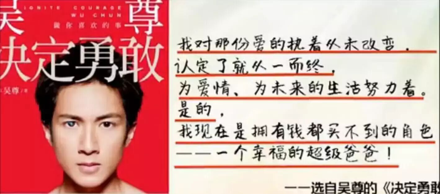 细心的朋友们会发现,有没有觉得他拍戏很有阶段性,2012年一整年都没有什么大的动作,其实不然,后来的事情大家也都知道咯,在2013年10月1日吴尊对媒体宣布他早已结婚生子,这一刻他决定勇敢!