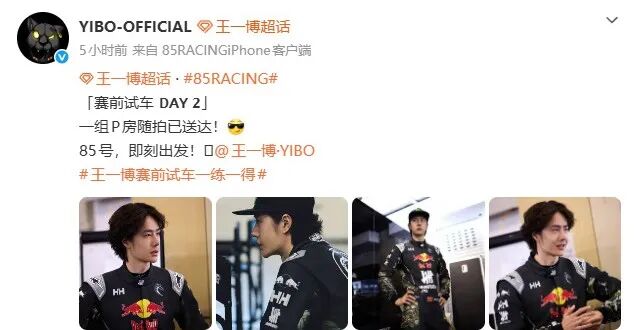 4月8日,王一博工作室再次发文:赛前试车DAY2,一组P房随拍已送达,85号,即刻出发!